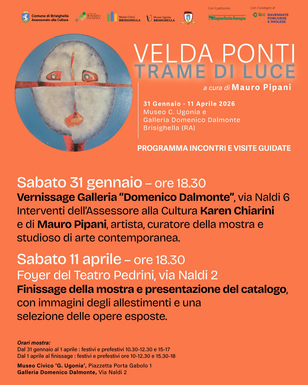 Sabato 11 aprile alle ore 18.30, presso il Foyer del Teatro Pedrini, via Naldi 2, Brisighella (RA), si terrà il finissage della mostra “Velda Ponti – Trame di Luce”. L’evento prevede la presentazione del catalogo della mostra, con immagini degli allestimenti e una selezione delle opere esposte, offrendo al pubblico un’occasione unica per rivedere e approfondire il percorso artistico dell’autrice.